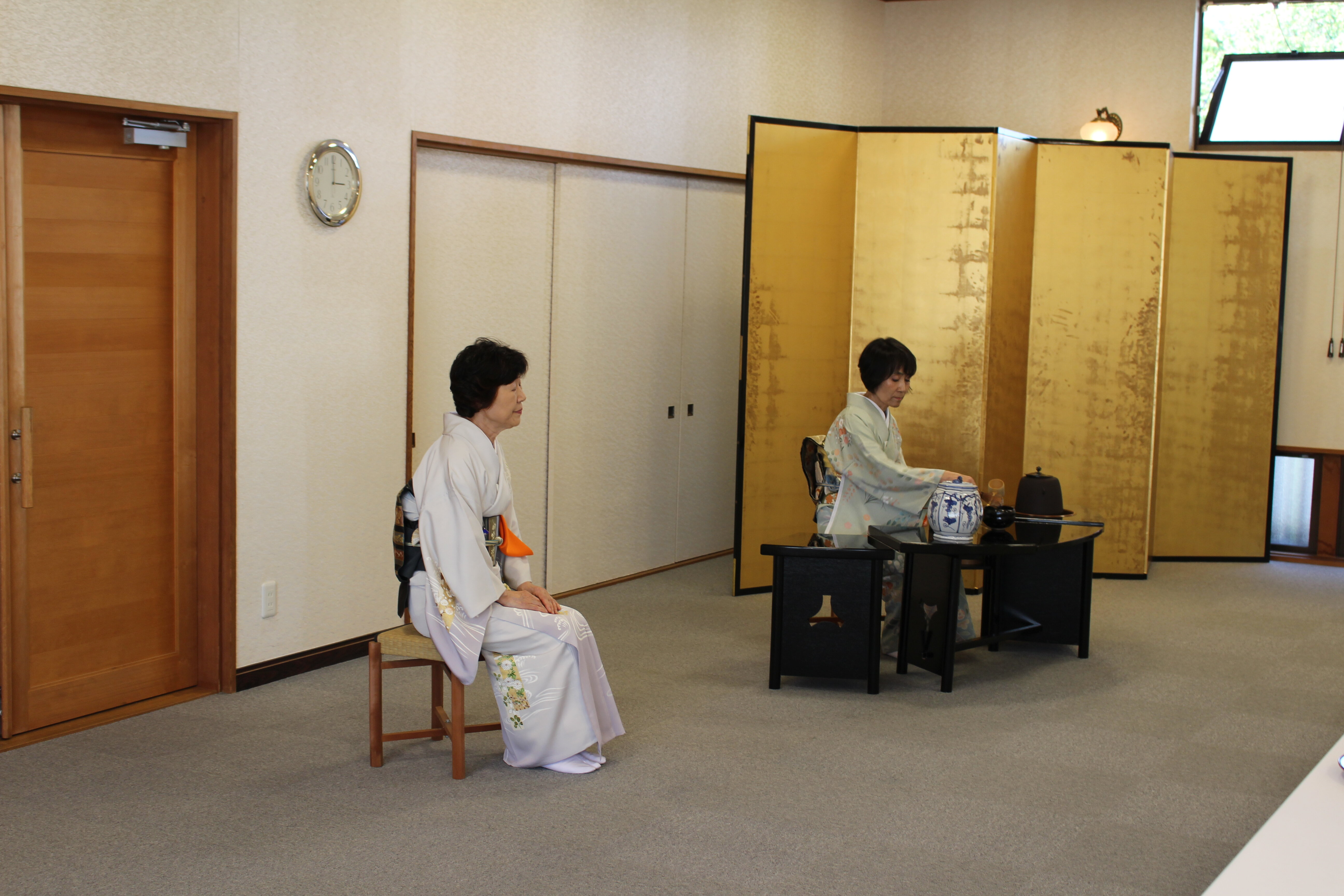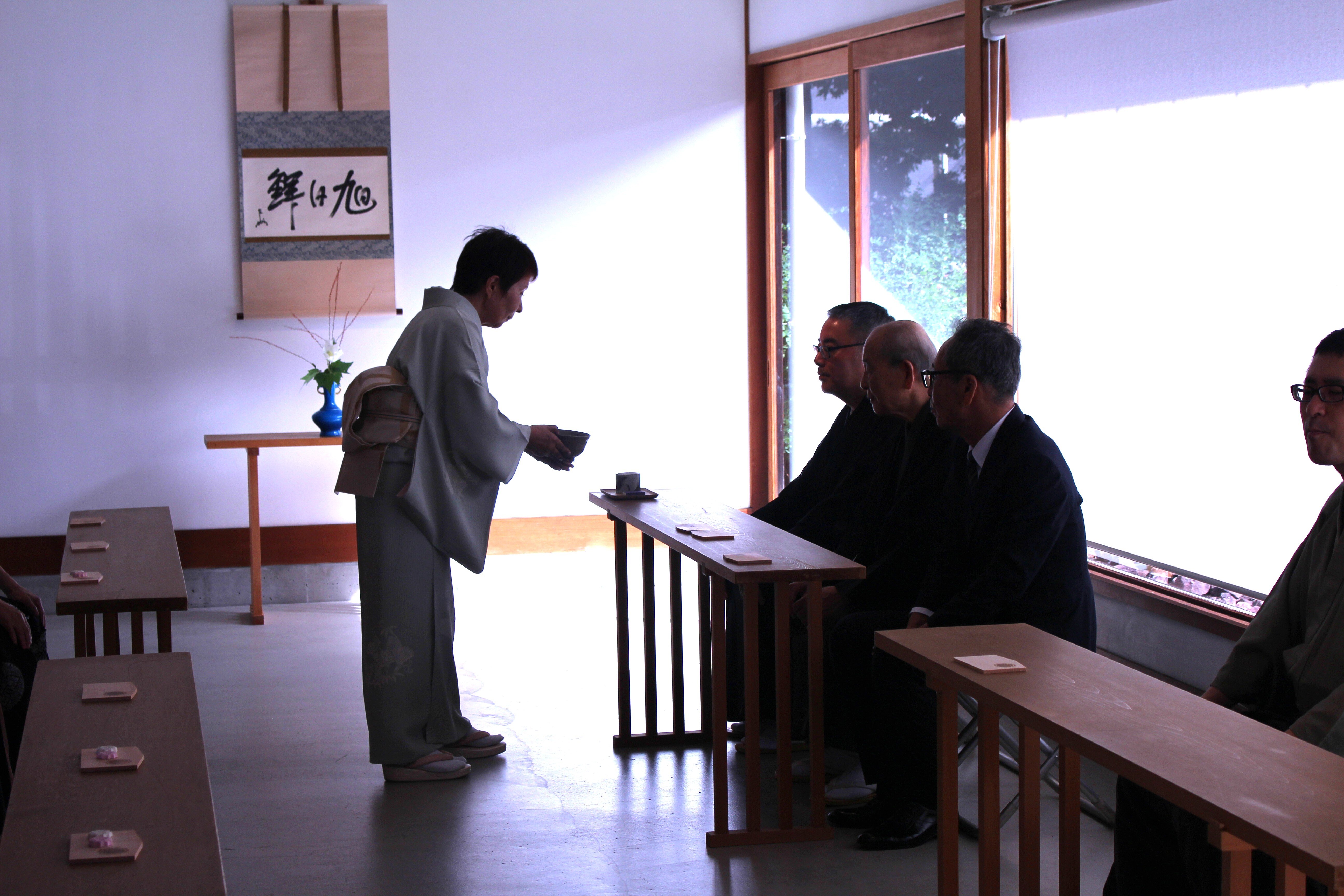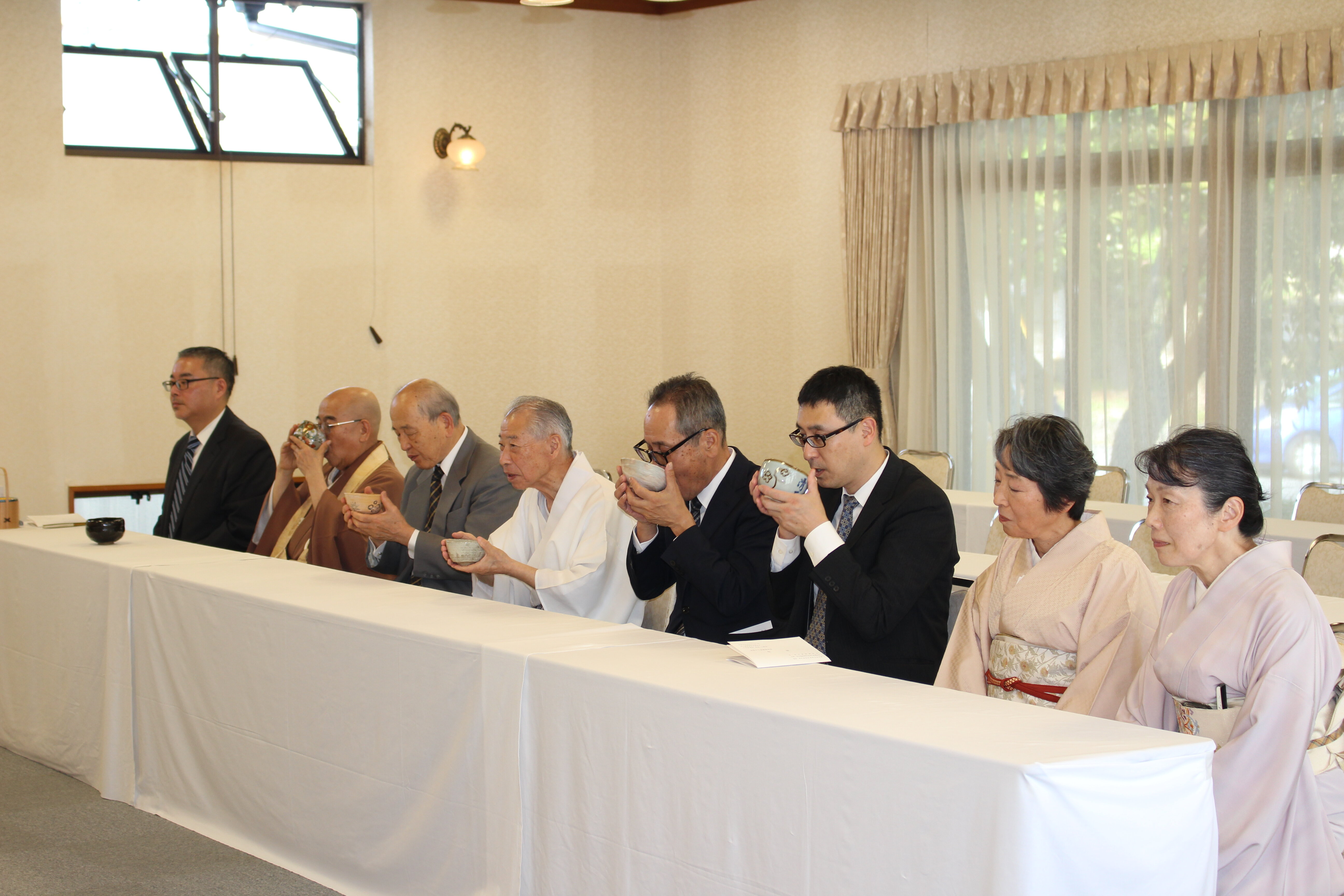 献茶式は、散華された英靈が、末期の水もいただけぬまま亡くなられたことに思ひを馳せ、故郷の清水で点てられたお茶を当代一流の茶人によつて捧げ奉るものであり、10月5日の秋季例大祭に先立ち滞りなく齋行されました。