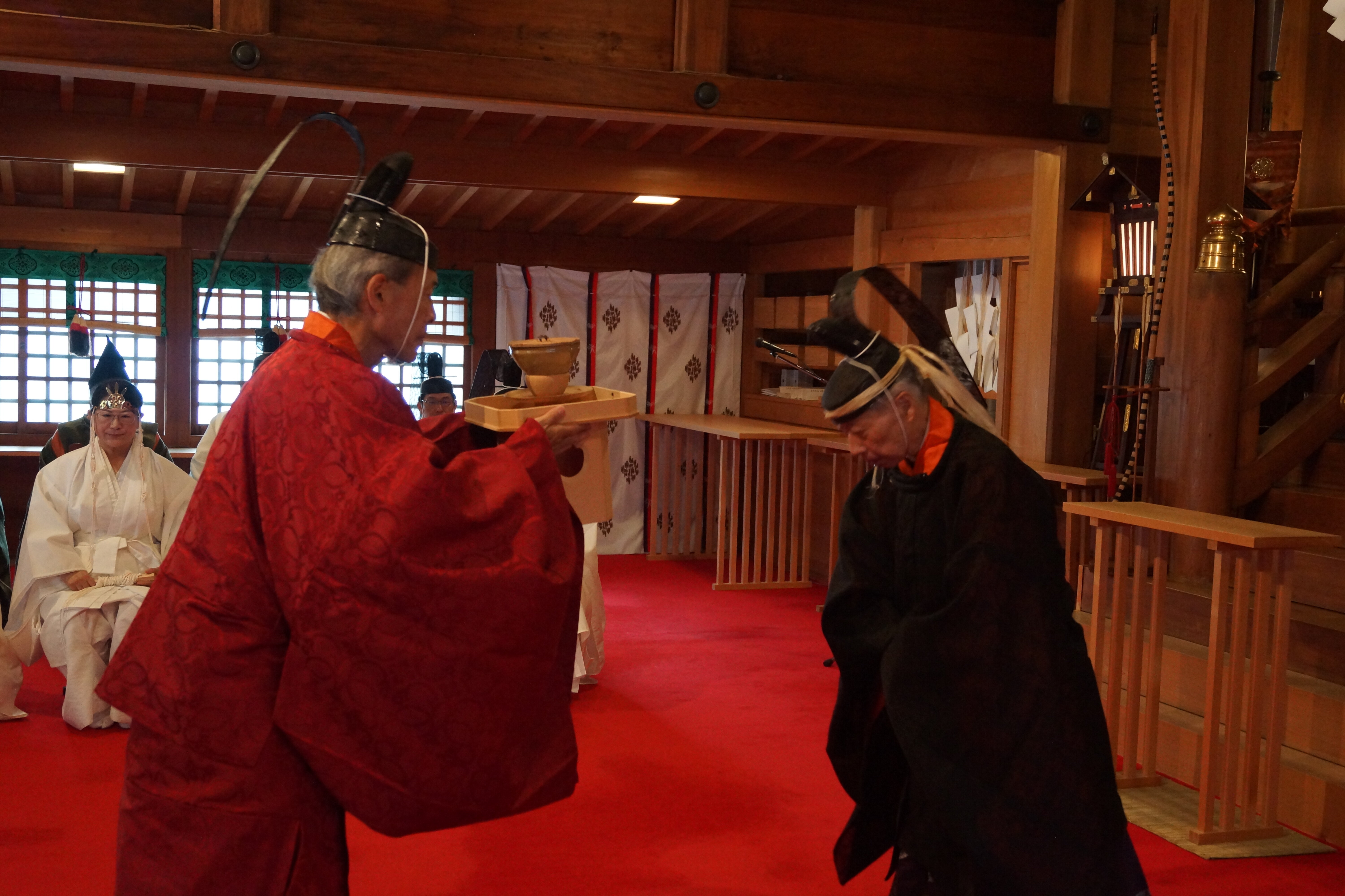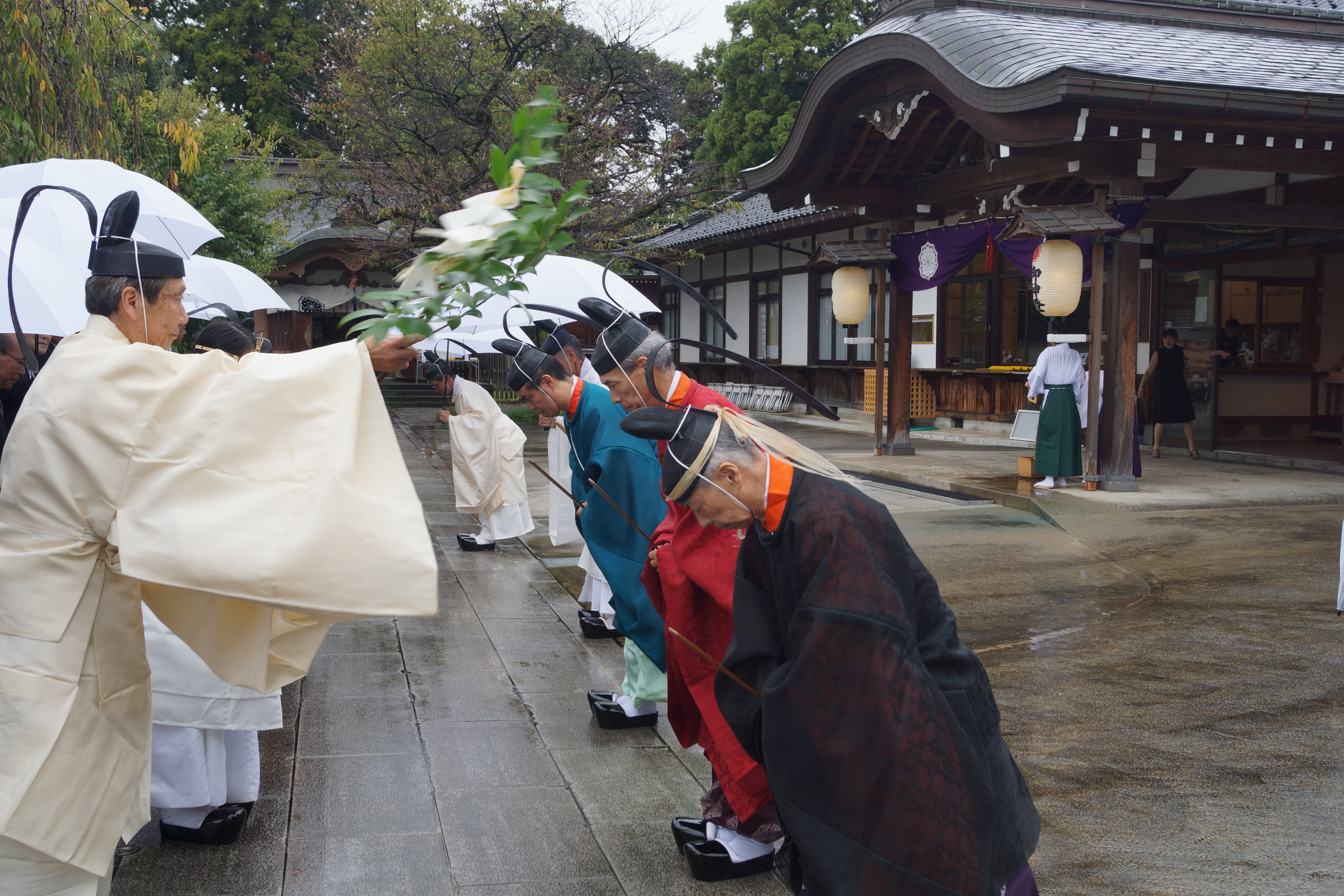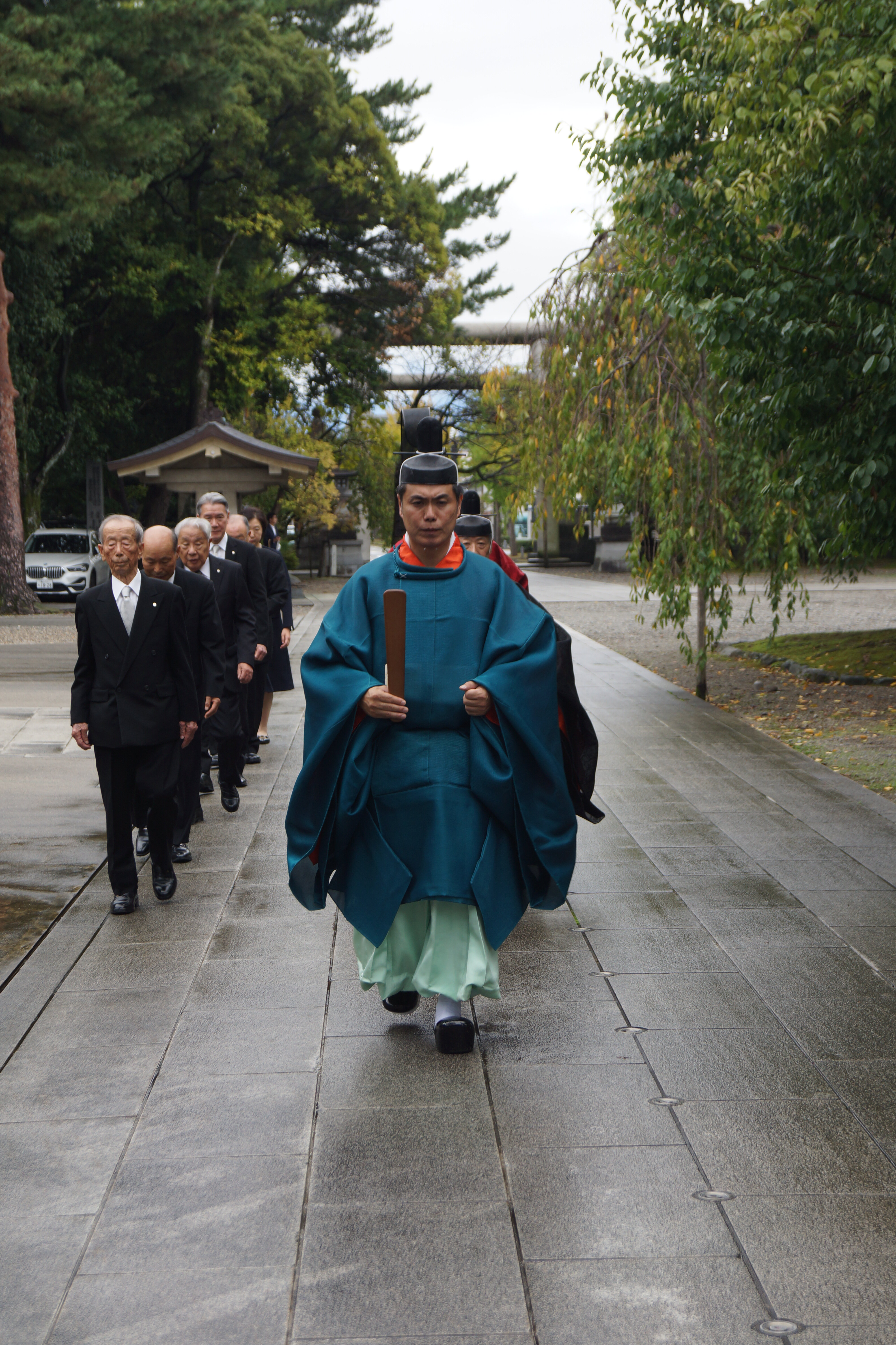 新田八朗崇敬総代会長が参向使となり、富山県神社庁各支部の神職・富山県神道青年会から齋員の御奉仕をいただき、雅楽の演奏を高岡市福岡町の洋遊会(山田三夫会長)に御奉仕頂きました。