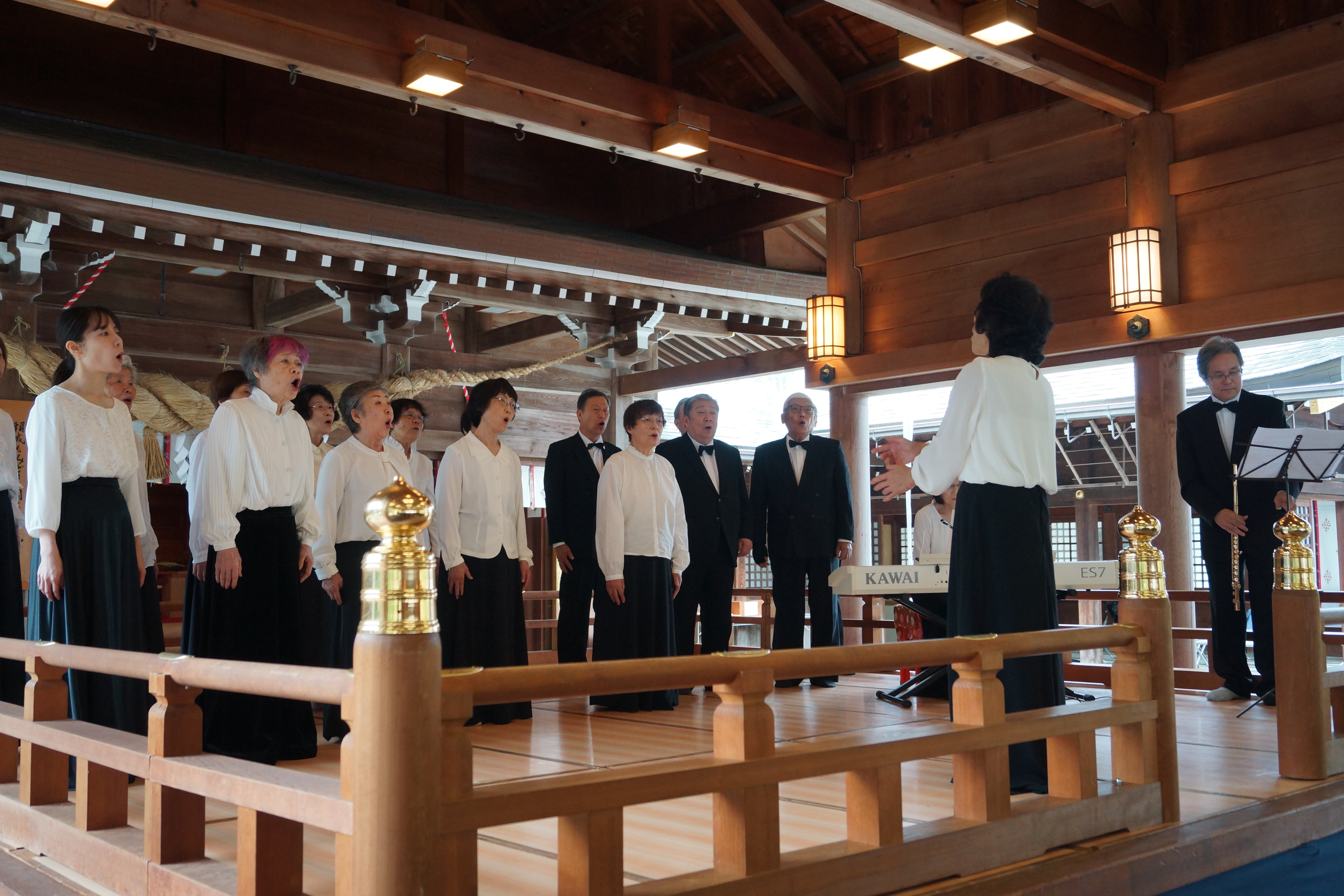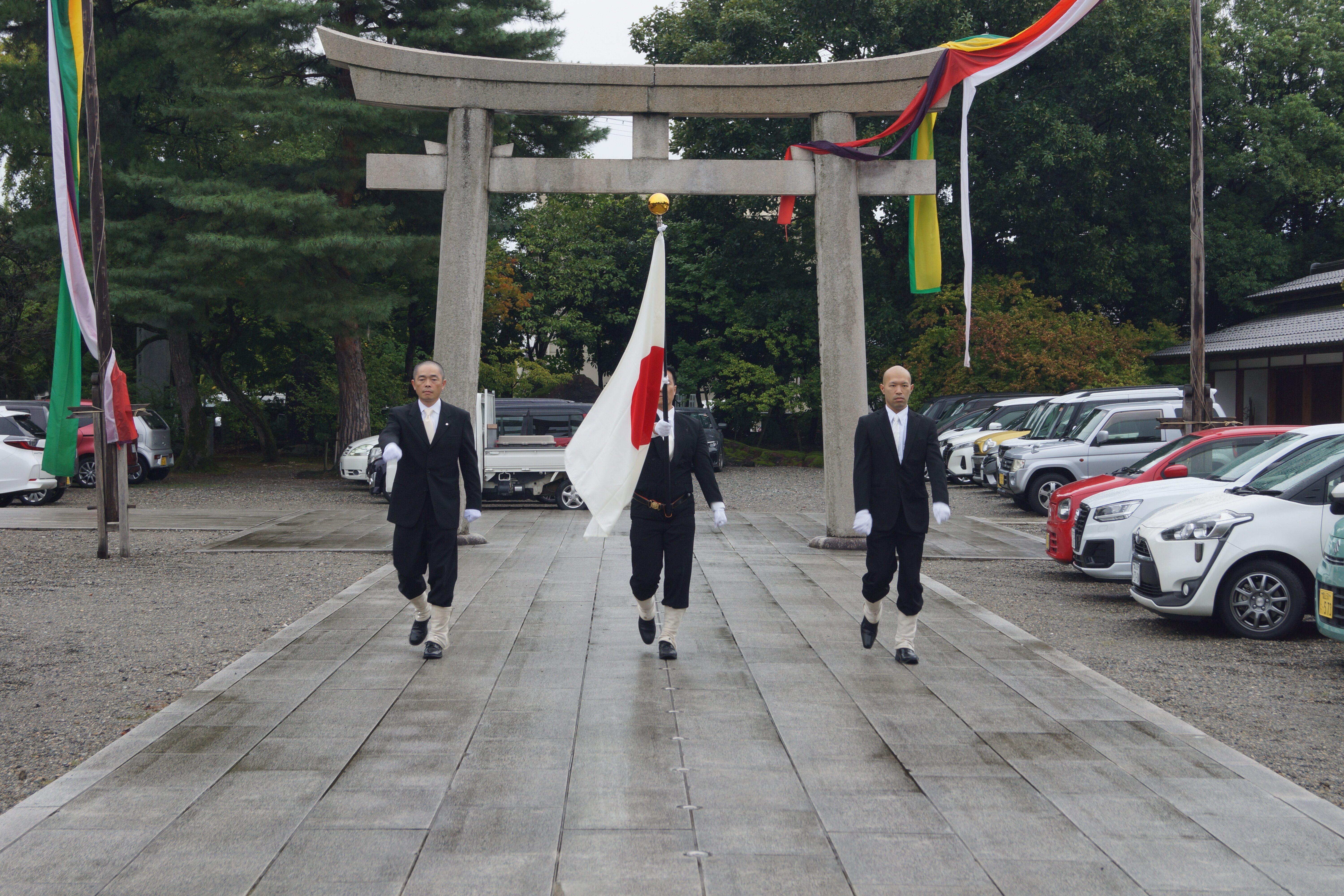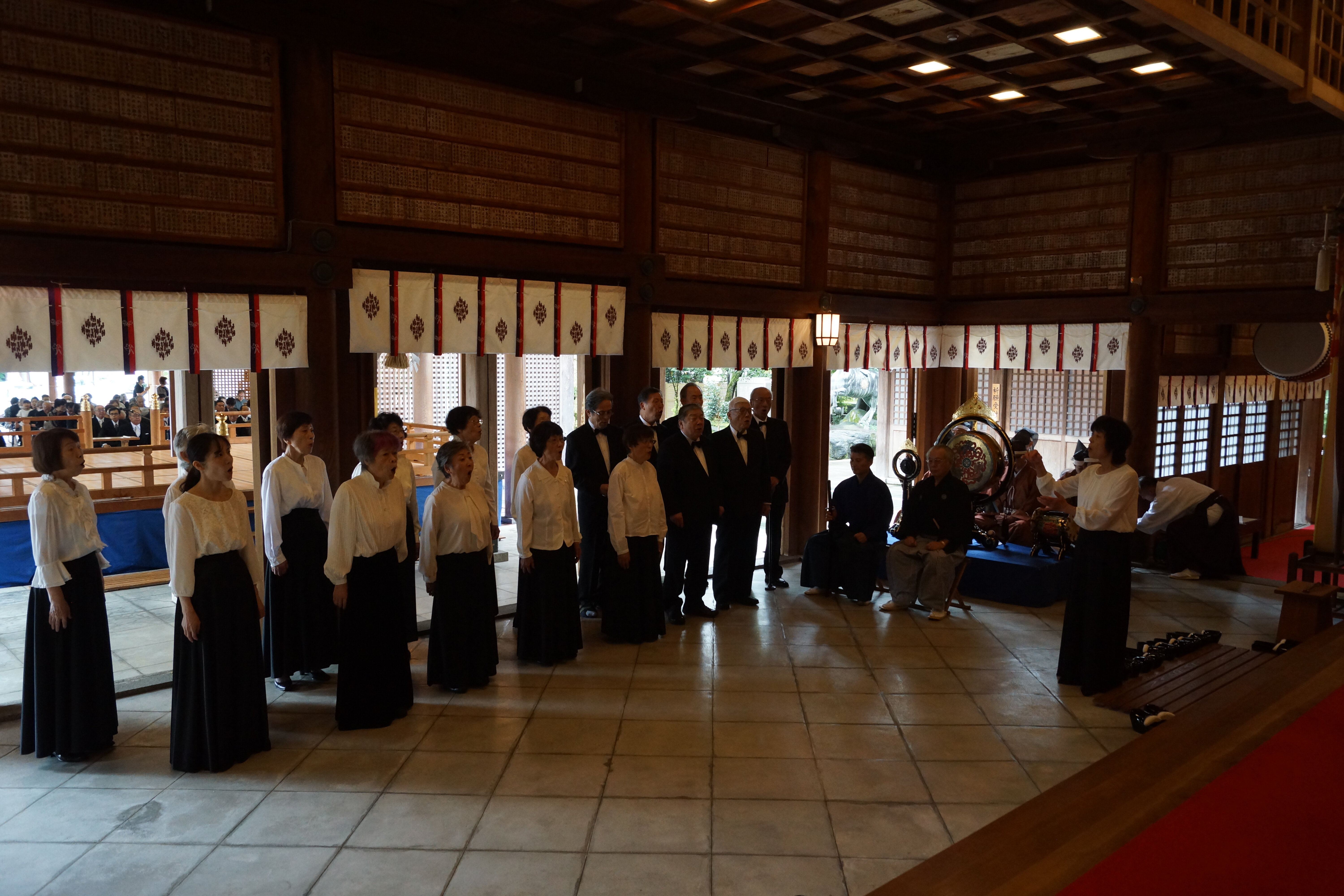 そして祭典中、國旗掲揚、國旗奉持は隊友会劔部の名村典泰様、中島秀雄様、惣名優様、西島茂太様に御奉仕いただき、献饌の儀では富山交聲合唱団(黒坂康之会長)の皆様に『鎭魂頌』の合唱、さらに昭和天皇御製『秋深き』・今上陛下御製『五箇山を』の二首を奉唱頂きました。さらに今回は佐藤真様(作曲家佐藤進様の御子息)によるフルートの演奏も加わりました。