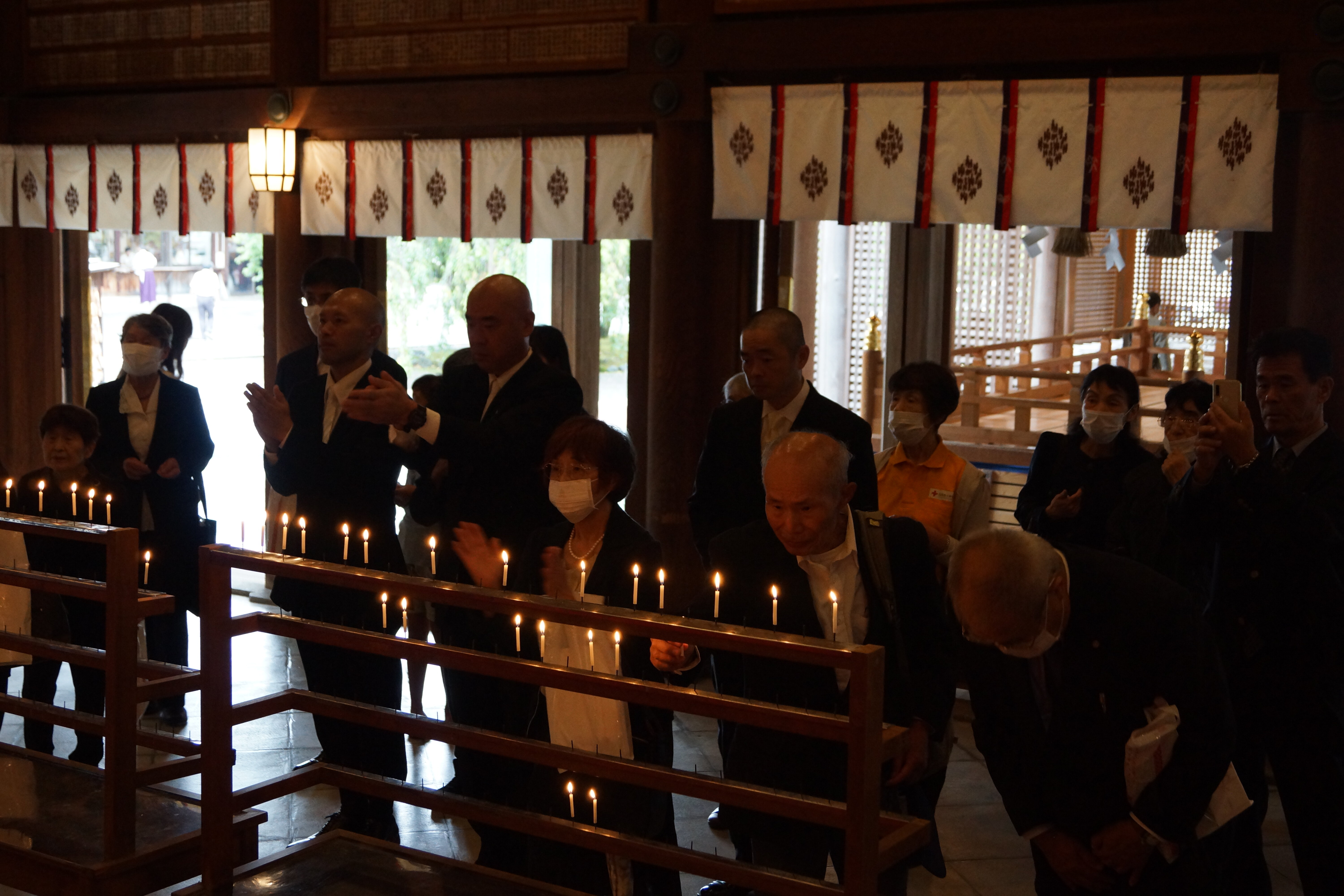 玉串拜禮では、各代表者が拜禮された後、射水市遺族会長の田中光男様が参列者を代表して玉串を捧げられ、参列者一同が合せて拜禮されました。そして祭典後、皆様には、御神前にてみあかしを灯して、参拜いただきました。