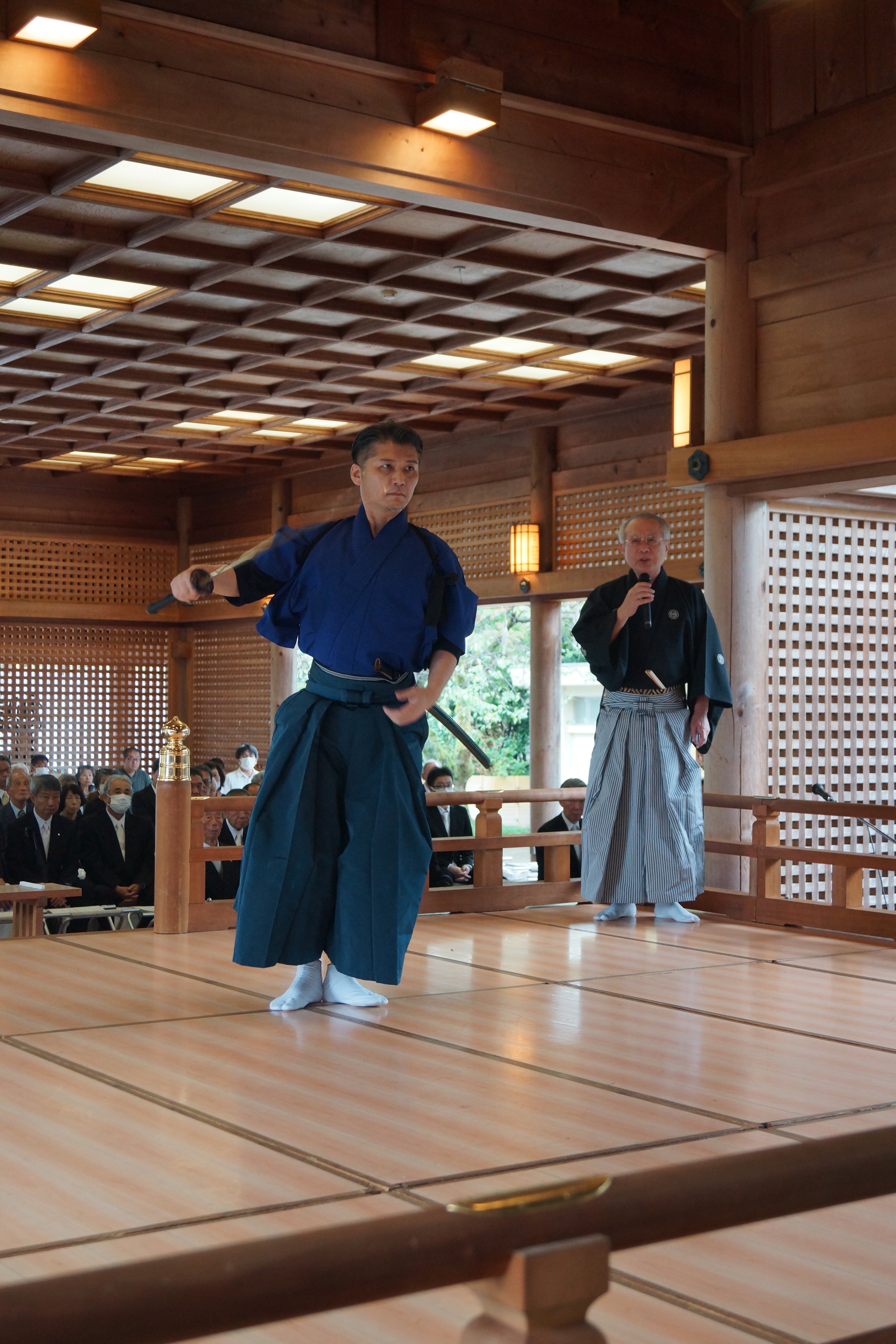 詩吟剣舞の奉納では、富山県詩吟剣舞連盟(稲垣岳峰会長)吟士 尾﨑岳鷹様 剣士 茶木基翠様による吟題『日本刀(にっぽんとう)』-大鳥圭介作 が奉納されました。