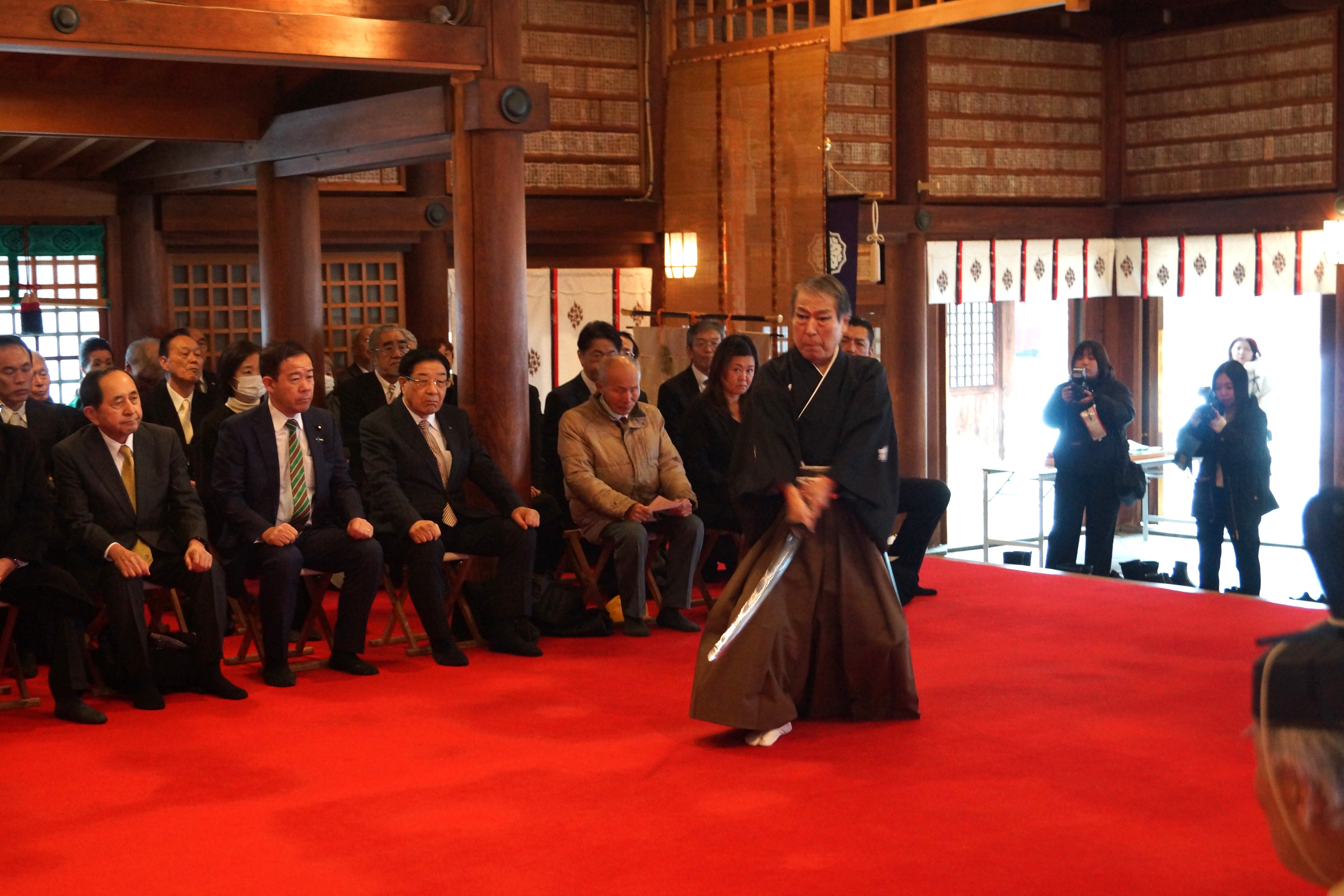 祭典では、まずはじめに國歌を斉唱致しました。続いて、修祓の儀、献饌の儀をおこなひ、宮司祝詞奏上の後、神武天皇をお祀りする橿原神宮・宮崎神宮を遙拜、次に富山県詩吟剣舞連盟 吟士 本多勝岳氏、剣士 滝野竜月氏による吟題『敷島の』(本居宣長作)の詩吟剣舞が奉納されました。