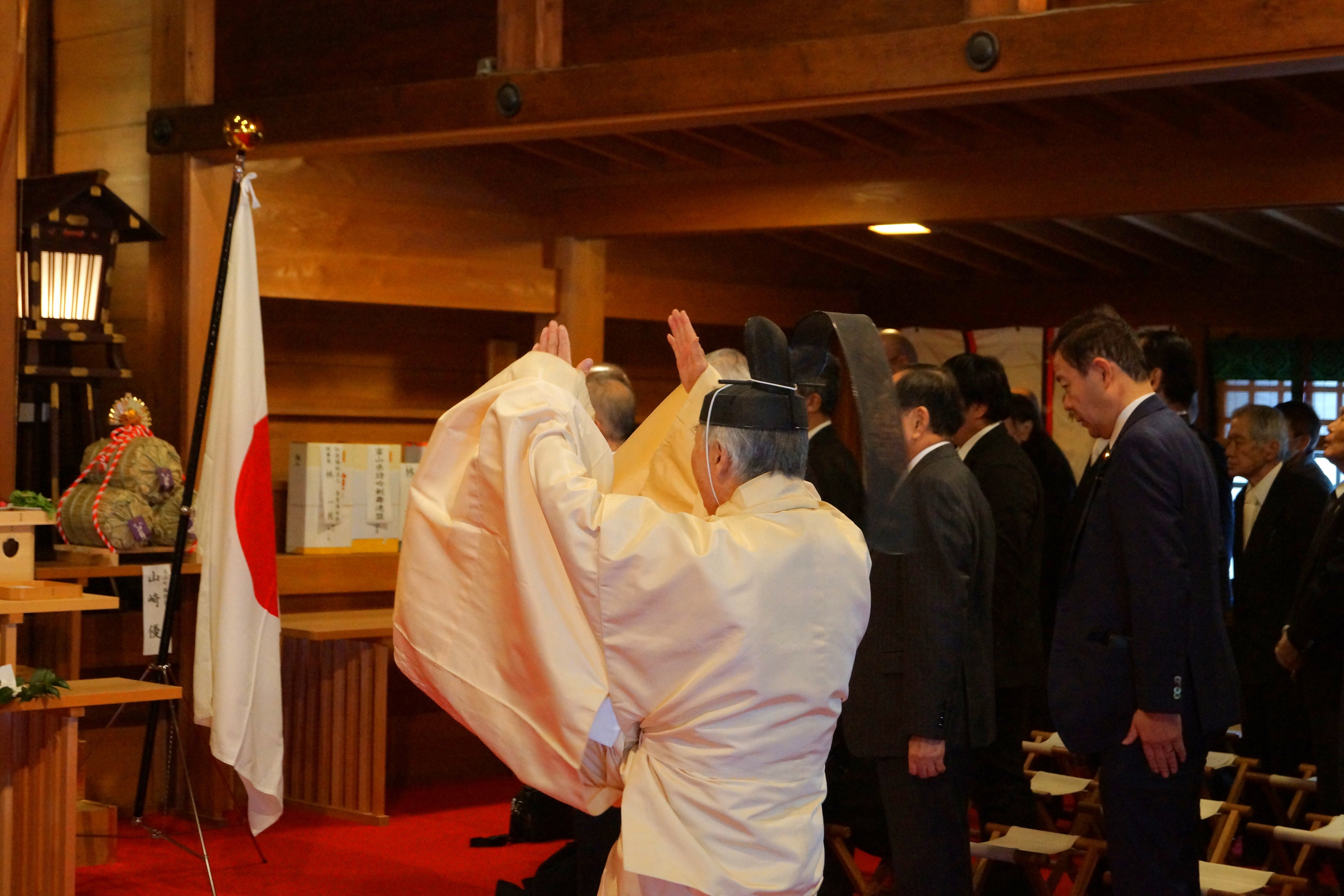 そして崇敬総代副会長 田林修一様、明治の日推進協議会 会長 中尾哲雄様、責任役員・日本会議富山 会長 高田順一様、富山県議会議員・日本会議富山地方議員連盟 中川忠昭様、衆議院議員 田畑裕明様が玉串を奉りて拜禮しました。